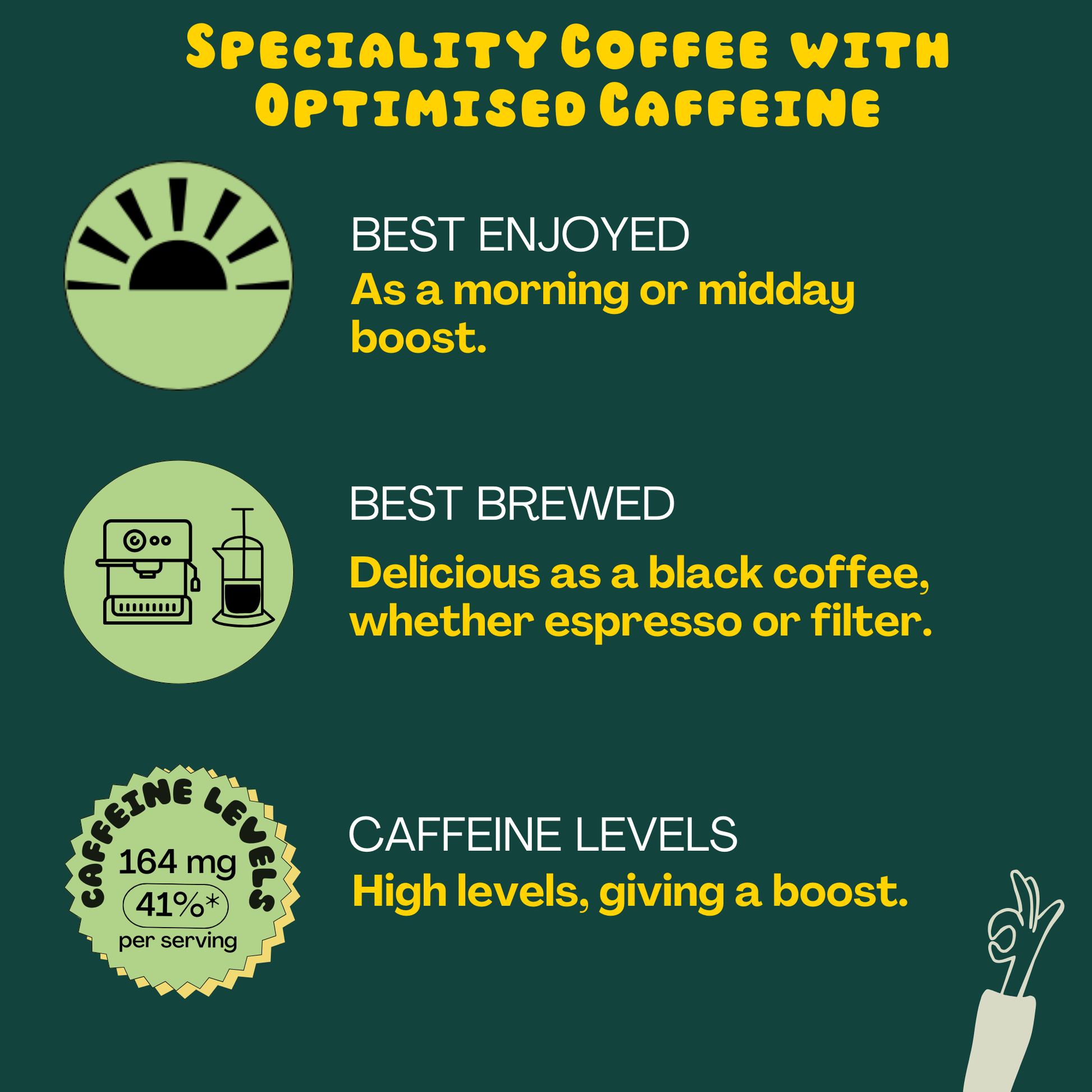 • A carefully curated range of great tasting speciality grade coffees that have been selected for flavour and caffeine levels.