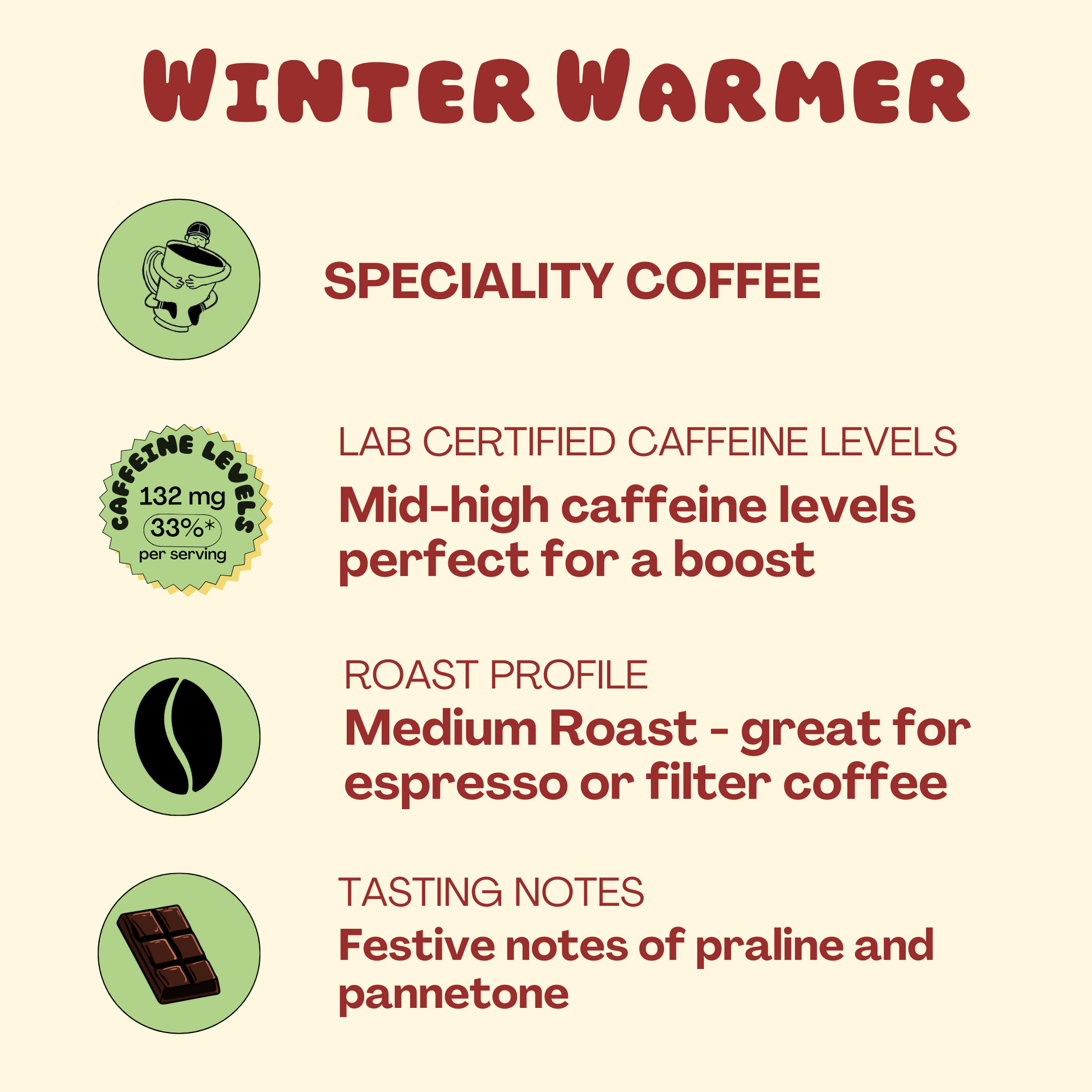 Tasting Experience Experience the festive flavours of praline and panettone in every sip. The medium roast profile brings out the natural sweetness whilst maintaining the full-bodied richness that makes this blend perfect for both black coffee enthusiasts and those who enjoy it with milk or milk alternatives.